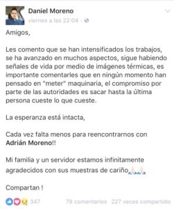 La esperanza y el amor, se hicieron presentes en cada uno de los días en que, familiares y amigos, acompañaron a las diferentes cuadrillas de topos, y a muchas personas que los apoyaron en la interminable espera; tanto en la cercanía como por mensajes en redes sociales. Desde las primeras horas los hashtags de #AdrianMoreno #AdrianMoreno286 y #FuerzaAdrianMoreno aparecían acompañados con mensajes de apoyo y cariño, porque ni un segundo, ni su novio Dario, ni su familia ni amigos se rindieron, y estamos seguros que Adrián tampoco lo hizo!