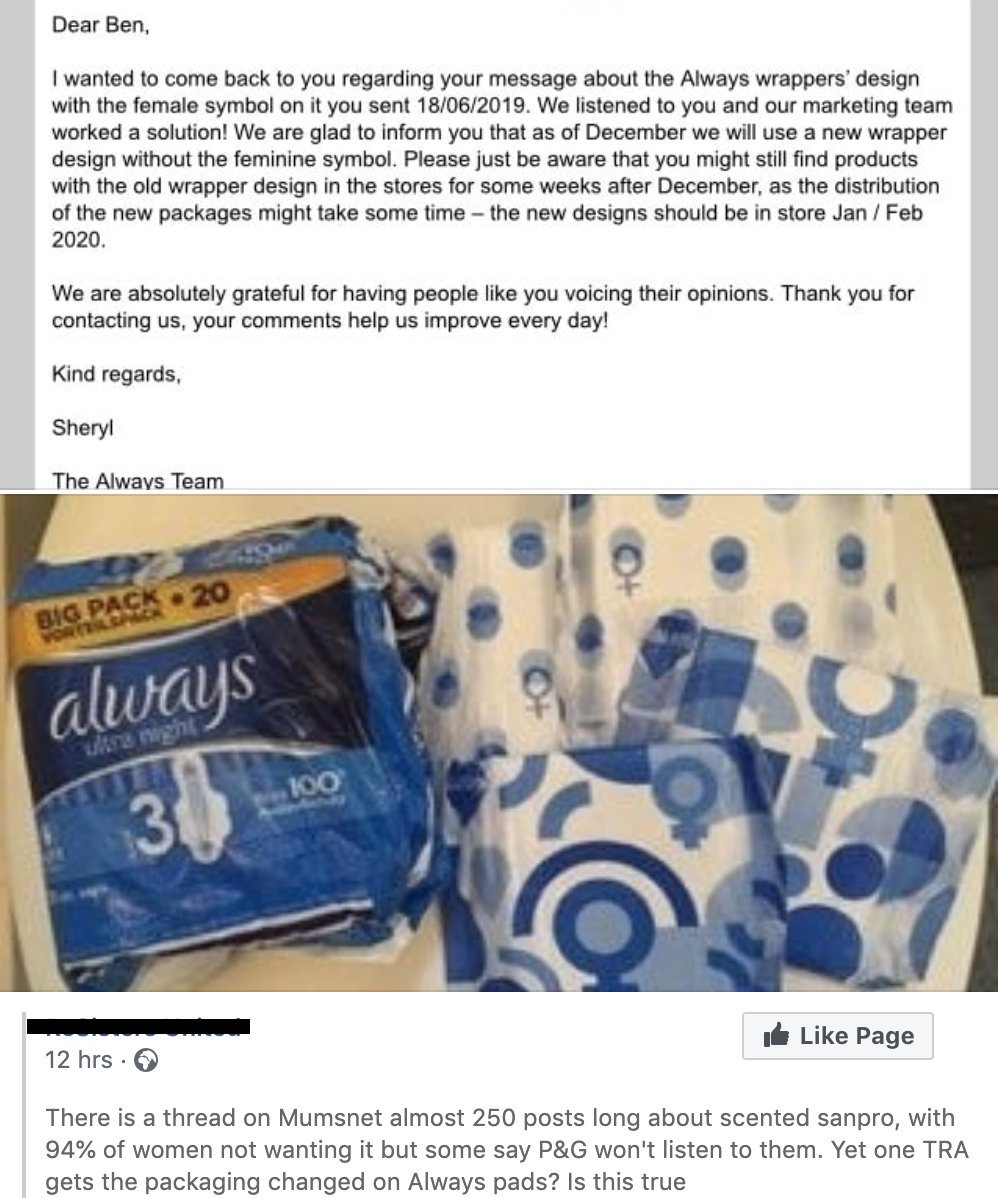 En esta carta se comunica que el equipo de marketing de Always está trabajando en eliminar el símbolo femenino de Venus ♀️ de sus productos de higiene menstrual y que se comprometen a sacar a la venta un nuevo diseño a partir de enero-febrero de 2020 sin el símbolo femenino.