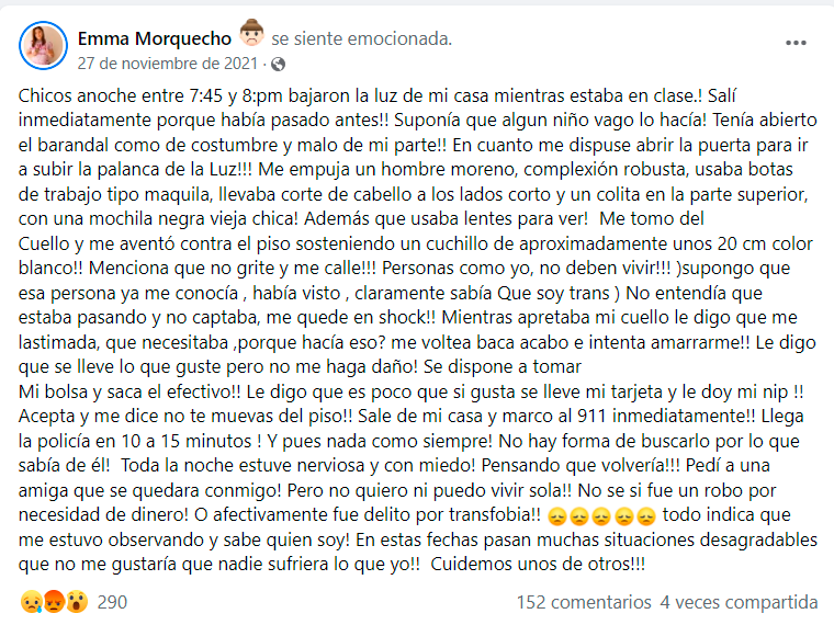 …“Me pasó en un torneó jugando voleibol, me sacaron porque era mujer trans; me pasó en mi trabajo, era maestra ya sabes en un pueblo, una de las mamás se quejó porque yo era mujer trans y ahora me pasó en mi casa nada más por ser trans”