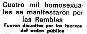 Unas cinco mil personas marchan pacíficamente desde la Avinguda de les Drassanes hasta la Font de Canaletes al coro de “Nosaltres no tenim por, nosaltres som” (Nosotros no tenemos miedo, nosotros somos), convocadas por el entonces ilegal Front d’Alliberament Gai de Catalunya (Frente de Liberación Gay de Cataluña – FAGC, antes Movimiento Español de Liberación Homosexual), creado por Francesc Francino y Armand de Fluvià.