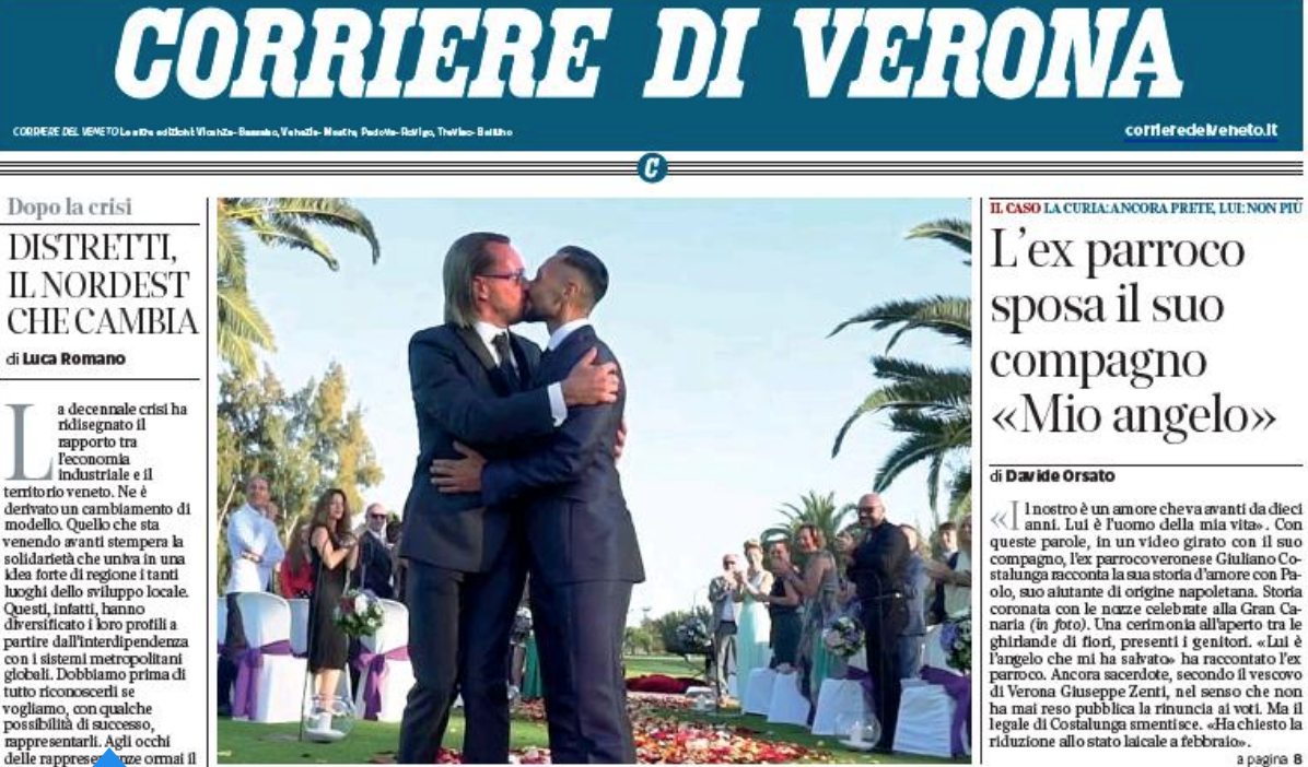 Cuando el amor se impone, no existen límites; ni la religión, ni la sociedad pueden acabar con él. Eso lo ha experimentado Giulano Costalunga, un ex sacerdote que tras ejercer por muchos años en Selva di Progno e Giazza, decidió dejarlo todo para casarse con Paolo, el amor de su vida.