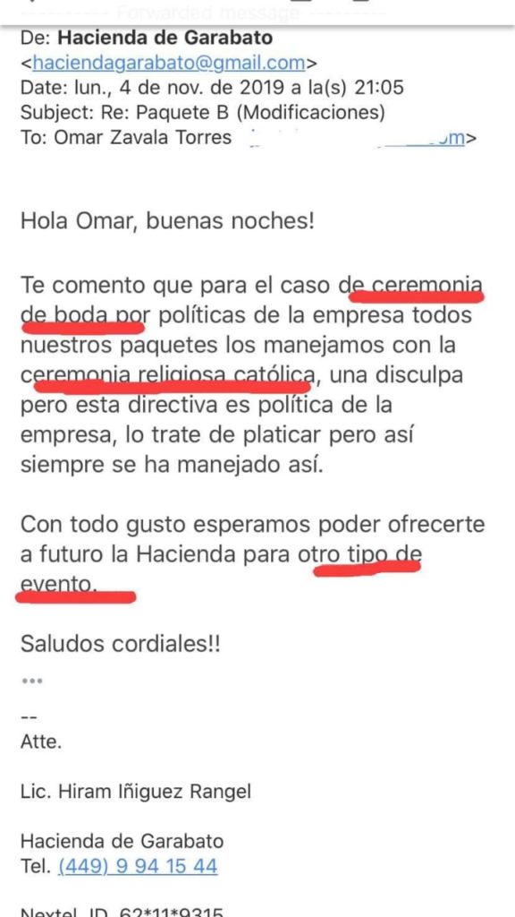 “(…) hemos recibido un correo donde se nos notifica que no nos pueden dar el servicio de la hacienda debido a que es OBLIGATORIA la CEREMONIA CATÓLICA en caso de que el evento sea una BODA”