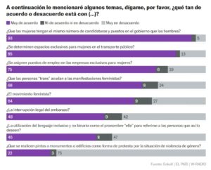 En la actualidad, el 64% de las mujeres muestra apoyo hacia el feminismo, reconociendo tanto sus aspectos positivos como negativos. Por otro lado, un 27% expresa un fuerte desacuerdo con el movimiento. Se observa que las mujeres más jóvenes tienden a estar más convencidas del feminismo, mientras que aquellas de entre 40 y 50 años son las menos propensas a identificarse como feministas. Las principales razones que motivan a las mujeres a unirse al movimiento son la lucha por los derechos y la igualdad de oportunidades, mientras que aquellas que se mantienen al margen lo hacen debido a la percepción de que algunas activistas realizan actos vandálicos y actúan con violencia. Estos resultados reflejan una división interna entre las mujeres en relación con el feminismo, destacando cómo las mismas cuestiones que generaron interés público también generan discordia dentro del movimiento.