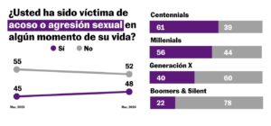 Según la encuesta, el 48% de las mujeres encuestadas afirma haber sido víctima de acoso o agresión sexual en algún momento de su vida. Estos ataques ocurren con mayor frecuencia en espacios públicos como la calle, el trabajo y el transporte público, aunque también se registran casos dentro del hogar. Alarmantemente, el 19% de las mujeres reportó haber sufrido agresiones dentro de su propia casa, siendo la pareja el agresor más señalado en el 66% de los casos.