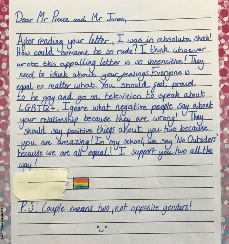 “Estimados Sr. Preece y Sr. Jones. Después de leer su carta, ¡estaba en shock absoluto! ¿Cómo puede alguien ser tan grosero? Creo que quienquiera que haya escrito esta espantosa carta es muy insensible. Necesitan pensar en sus sentimientos. Todos somos iguales pase lo que pase. Deben sentirse orgullosos de ser gays e ir a la televisión para hablar sobre LGBTQ+. ¡Ignoren lo que dicen las personas negativas sobre su relación porque están equivocadas! ¡Deberían decir cosas positivas sobre ustedes dos porque son increíbles! ¡En mi escuela decimos ´No forasteros´ porque todos somos iguales! ¡Los apoyo a los dos todo el tiempo! PD: Pareja significa dos. ¡No de géneros opuestos!”, escribió la niña.