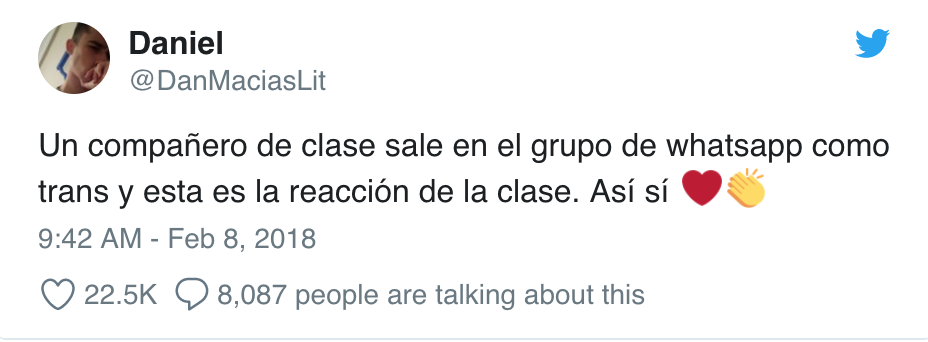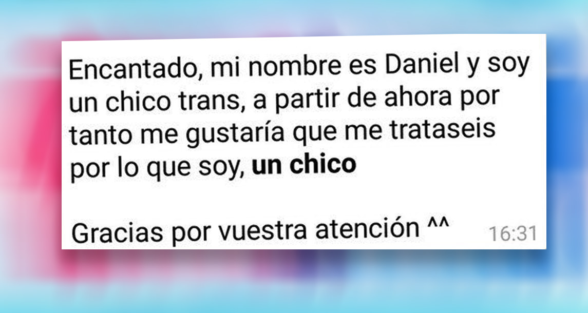 El joven Daniel, compartió en su cuenta de twitter (@danmaciaslit)  una serie de screenshots en los que un compañero de él, sale del clóset como chico trans, y les pide a sus compañeros de clase que ahora se refieran a él como Daniel.