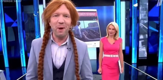 Anatoly Kuzichev usó una peluca para burlarse de Laurel Hubbard (Imagen: Channel One Rusia / Ella Millward)