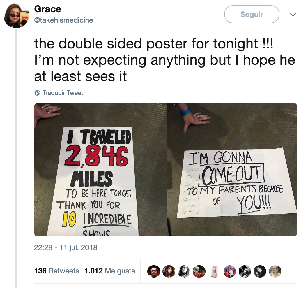 En el primer cartel dice: “Viajé 2,846 millas para estar esta noche. Gracias por tus 10 increíbles shows” y en el segundo: “VOY A SALIR DEL CLÓSET CON MIS PAPÁS GRACIAS A TI”.