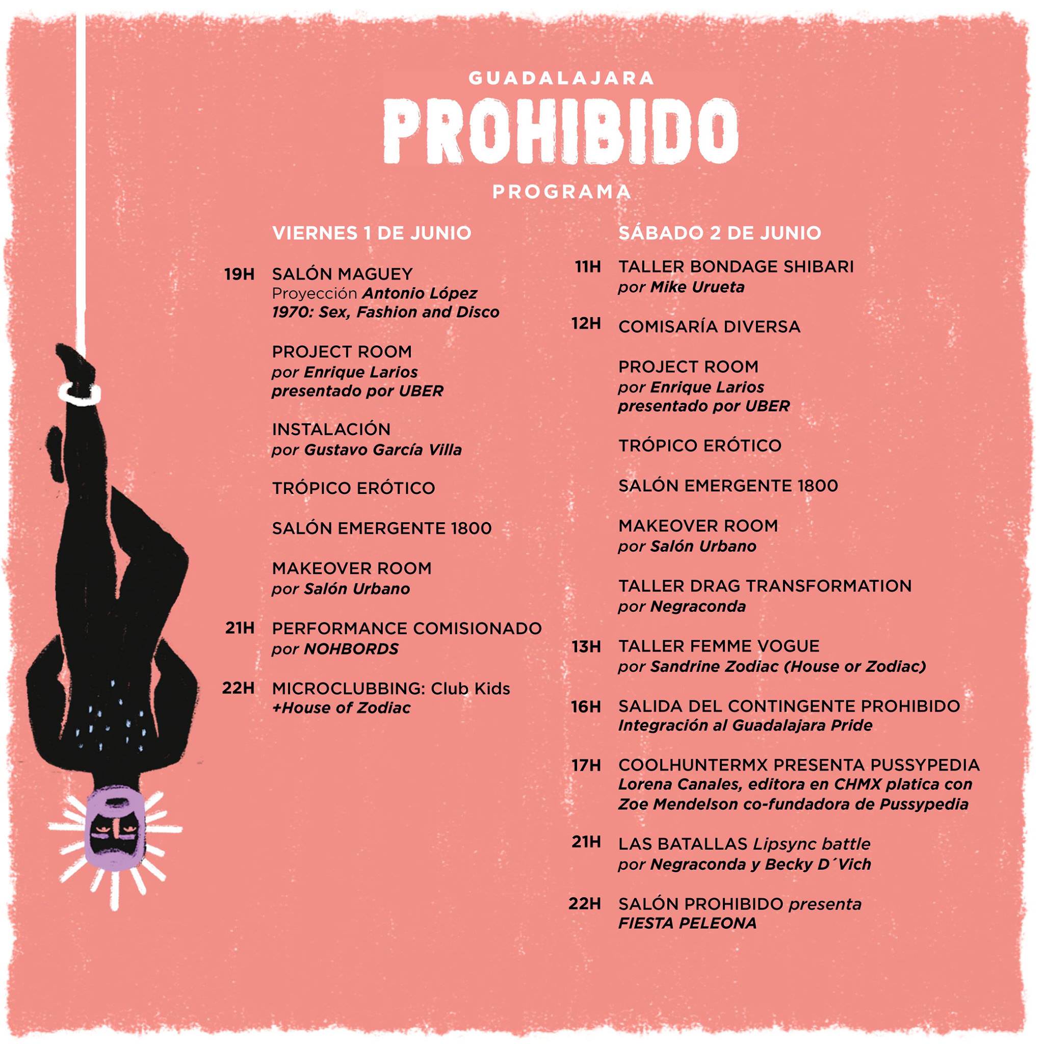Habrá Lipsync Battle, Makeover Room, Trópico Erótico y la presentación de la Pussypedia, para finalizar con la Fiesta Peleona. Además de que habrá un contingente de Prohibido que saldrá a marchar en el Guadalajara Pride.