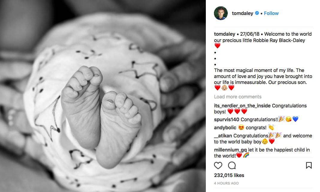 Daley subió una foto a Instagram con un mensaje de los pies de su hijo recién nacido, diciendo que su fecha de nacimiento era el 27 de junio de 2018 y confirmando el nombre de su hijo, que es el mismo del papá de Dustin.