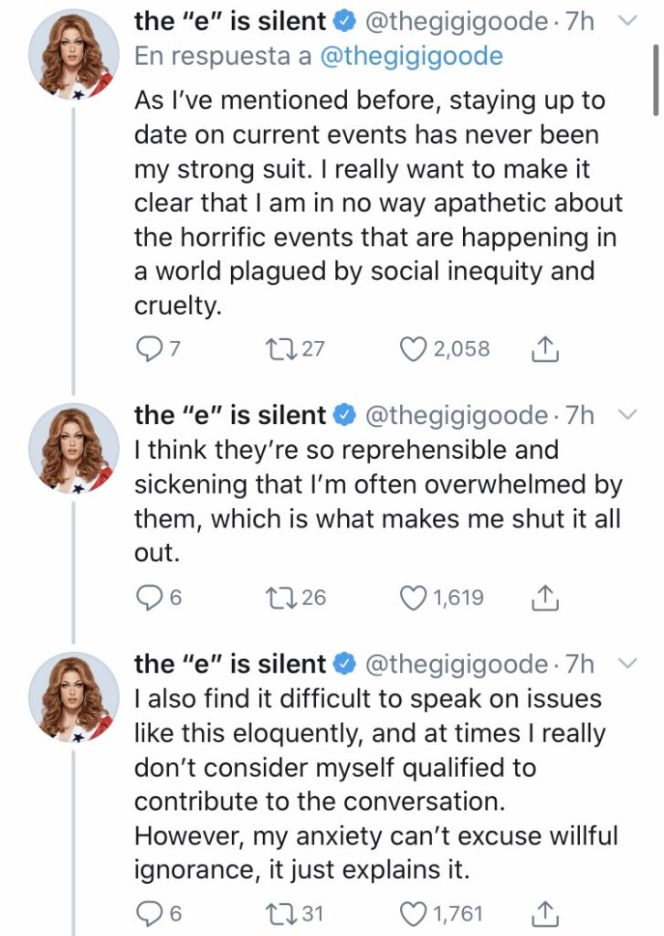 ¿Fue esto lo que realmente hizo Gigi? Al parecer no. La drag queen utilizó sus redes sociales para reprobar el asesinato de Floyd y aseguró que en ningún momento quiso ser apática con respecto a esto. Explicó que le cuesta hablar sobre temas políticos y sociales puesto que no se siente apta para hacerlo, ya que nunca ha sido una persona que se caracterice por estar bien informada y resaltó que esto sólo demuestra su ignorancia.