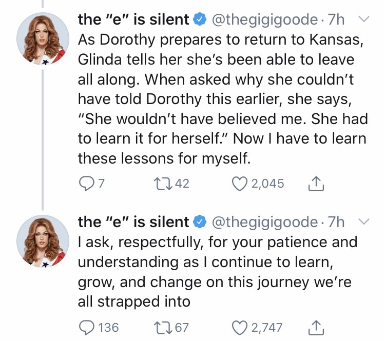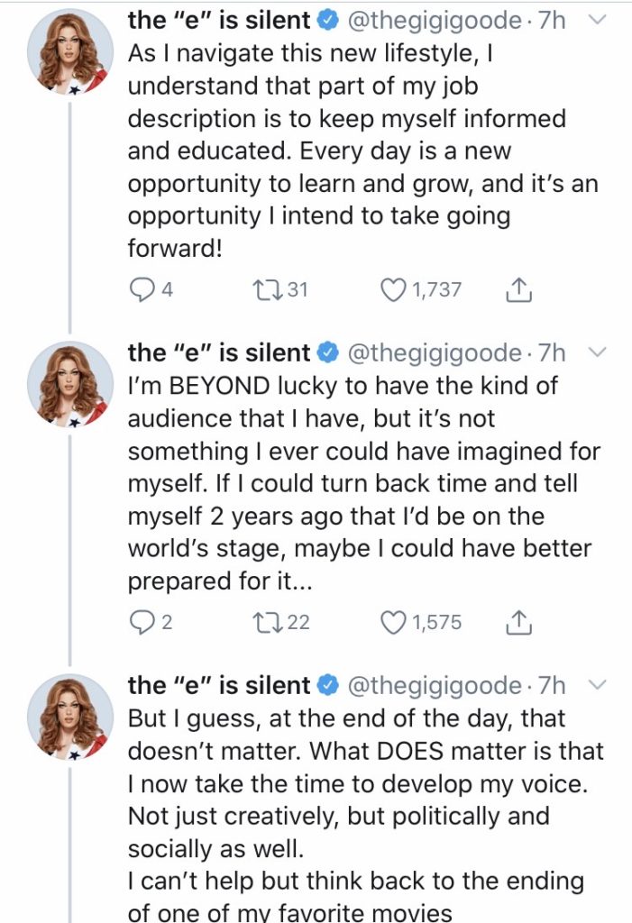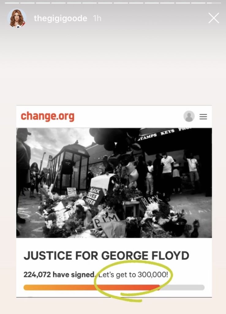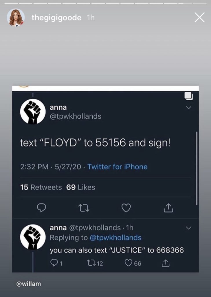Gigi hizo hincapié en que ahora entiende que parte de tener esta nueva plataforma significa estar informada y seguir educándose, lo cual pretende hacer de ahora en adelante, aceptando que no estaba preparada para este tipo de situaciones. Terminó su declaración pidiendo a los fans paciencia y entendimiento mientras ella sigue creciendo en este viaje en el que estamos todos juntos. Goode aprovechó sus redes para compartir información sobre el caso de Floyd.