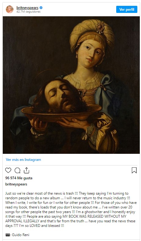La publicación de Spears sobre el supuesto nuevo álbum, que se rumoreaba falsamente, incluía una imagen de Salomé con la cabeza de Juan el Bautista.