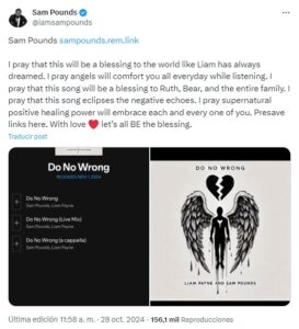 En un emotivo mensaje compartido en X (anteriormente Twitter), Sam expresó su deseo de que la canción sea “una bendición para el mundo. Rezo para que esta canción sea una bendición para el mundo, como Liam siempre ha soñado. Rezo para que los ángeles los consuelen a todos todos los días mientras la escuchan”.