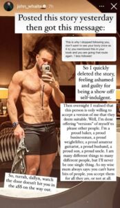 Whaite confesó sentirse “avergonzado y culpable por ser presumido / autoindulgente” y eliminó la historia en respuesta a la dura crítica.