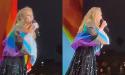 Adele sonríe mientras celebra el Orgullo envolviéndose en una bandera del arcoíris y agitándola en el aire mientras se presenta en el Festival BST Hyde Park....